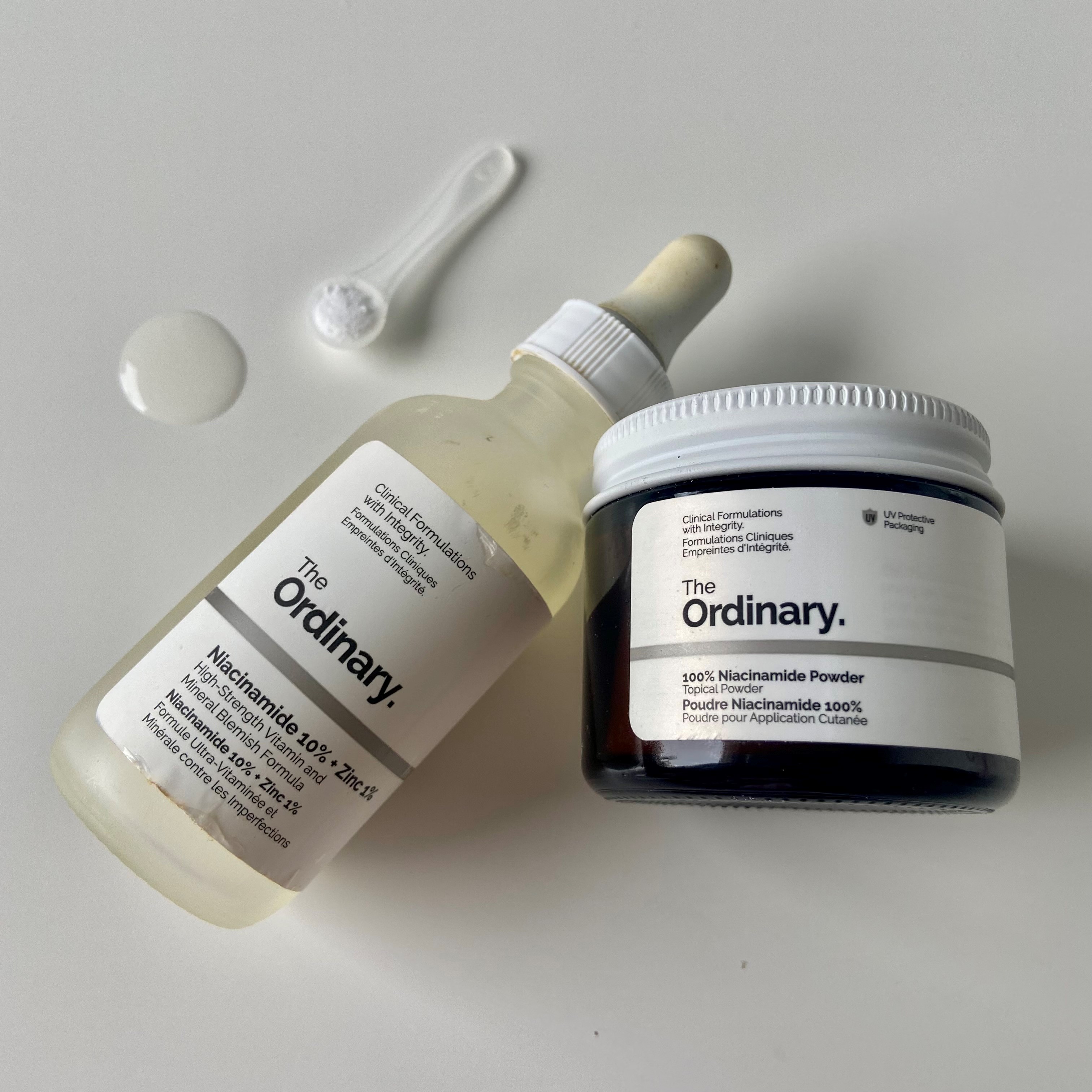 Pictured: The Ordinary 10% Niacinamide + Zinc 1% and 100% Niacinamide Powder
